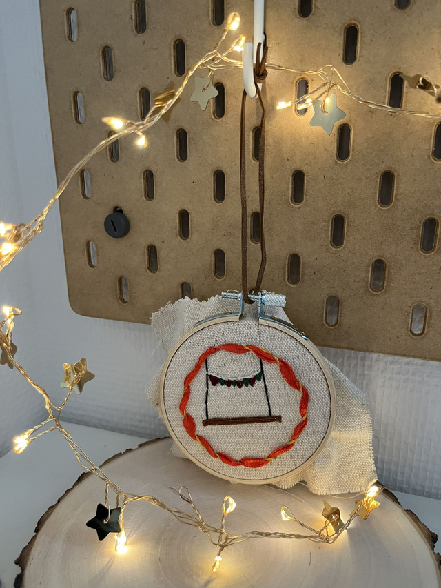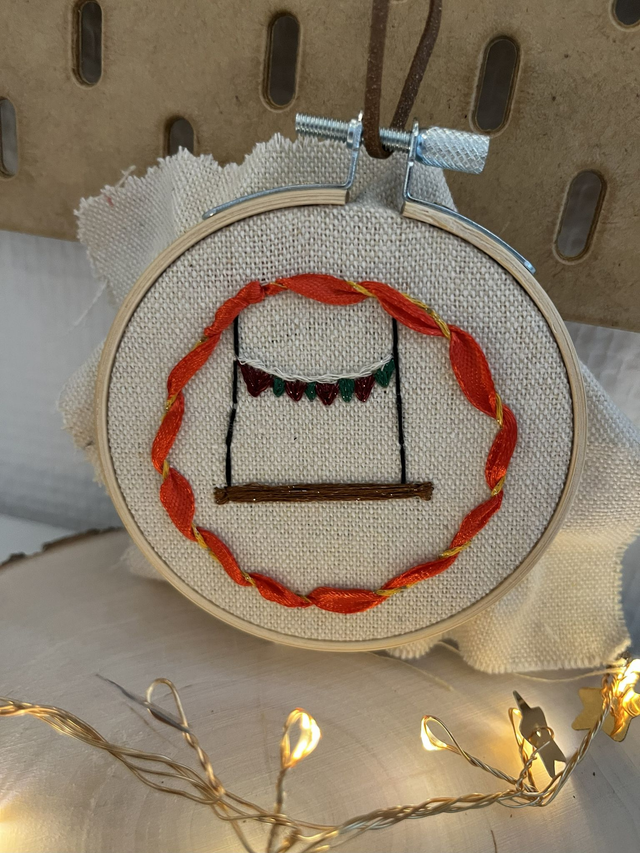 Tambour de 8cm de diamètre, tenu par une cordelette.