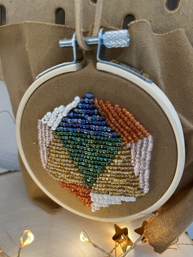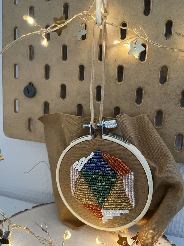 Tambour de 8cm de diamètre, tenu par une cordelette.