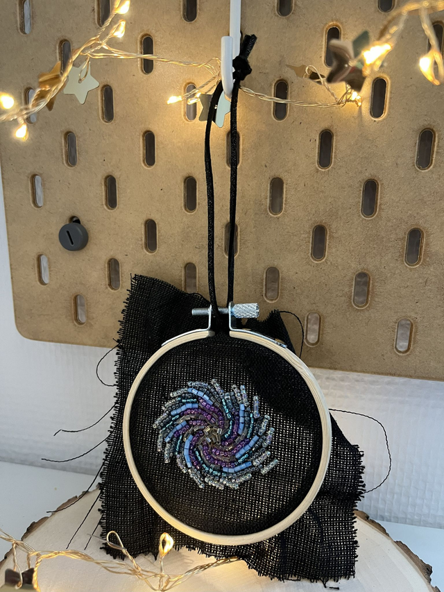 Tambour de 8cm de diamètre, tenu par une cordelette.